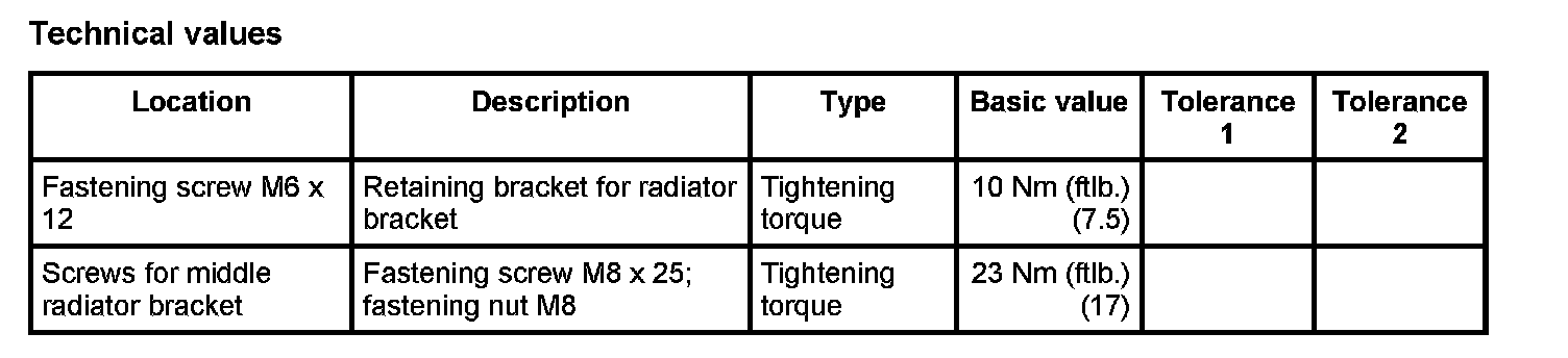 1. Insert middle radiator into bracket. Make sure that the rubber sleeves of the radiator are inserted into the corresponding cutout on the bracket or retaining bracket. Screw in two fastening screws on retaining bracket -> Tightening torque: 10 Nm (ftlb.) (7.5).