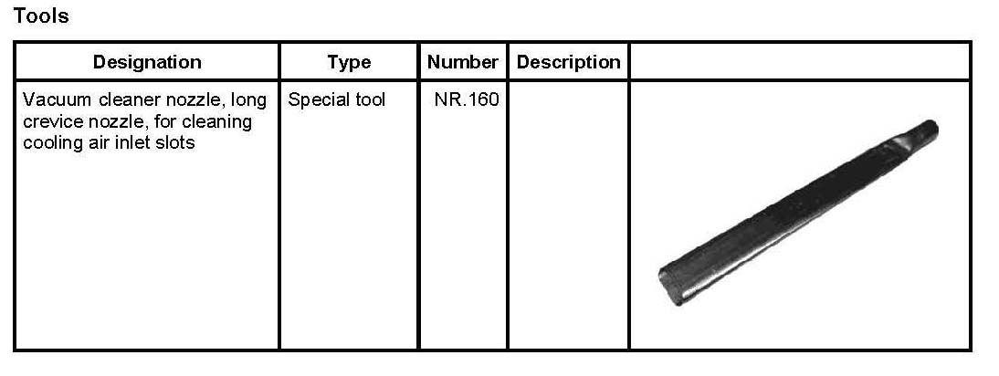 1. Check cooling air ducts and radiator for foreign bodies, such as leaves. If necessary, clean the cooling air ducts and radiator surfaces through the openings in the front apron using a vacuum cleaner and nozzle, see Vacuum cleaner nozzle, long crevice nozzle, for cleaning cooling air inlet slots NR.160. When using high-pressure steam cleaners, the steam jets can cause additional particles of dirt to attach to the radiator surfaces and the engine can overheat due to reduced cooling performance.