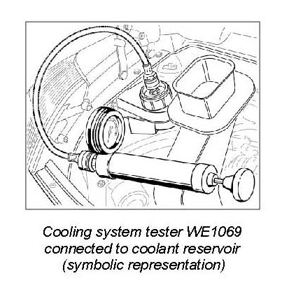 1. Check the cooling system for leaks. To do this, apply a test pressure of 1.8 bar using the cooling system tester (Porsche workshop equipment WE1069) and check hose connections for leaks.
