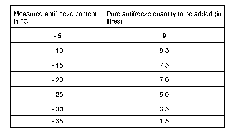 Note: The following table specifies how much coolant must be replaced by pure coolant in order to adjust the freezing point to -37°C.