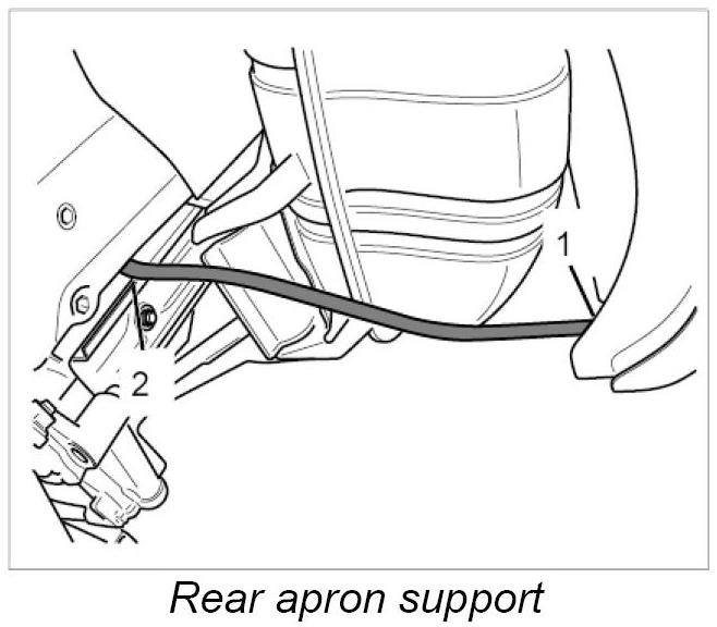 2. Remove strut for rear apron. Unscrew fastening screws -1 and 2- and remove strut.