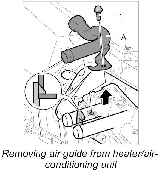 2. Unscrew fastening screw -1- for the air guide -A- and pull the air guide out of the heater/air-conditioning unit.