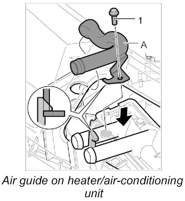 1. Press air guide -A- into the heater/air-conditioning unit, clip in place and screw down using the fastening screw -1 -.