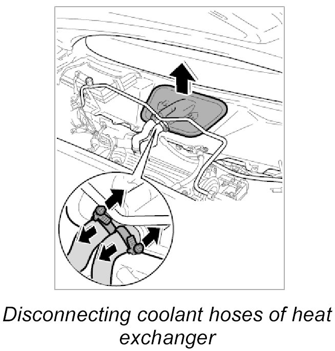 1. Release the two top fastening clamps for the coolant hoses of the heat exchanger and slide them back over the hoses.