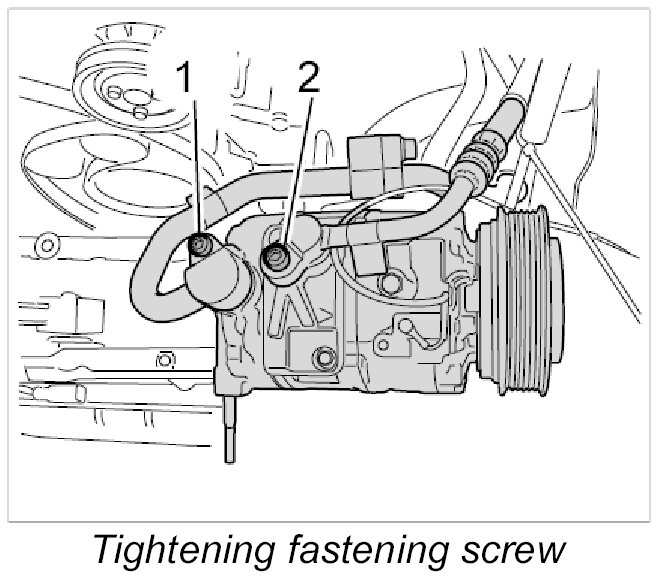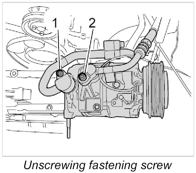 1. Unscrew the fastening screw -1- on the compressor.