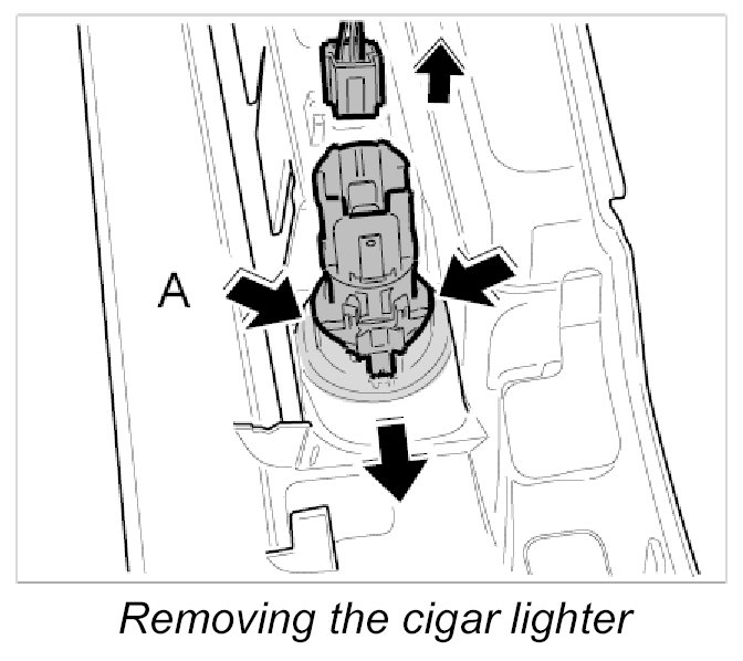 2. Press together the locks -A- and push out the cigar lighter out of the centre console.