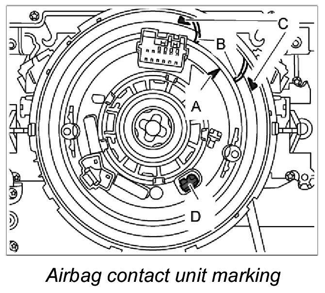 INFORMATION: Ensure that arrow -A- on the rotor is positioned between the markings -B- of the arrows -C- on the airbag contact unit and that the locking element -D- is engaged.