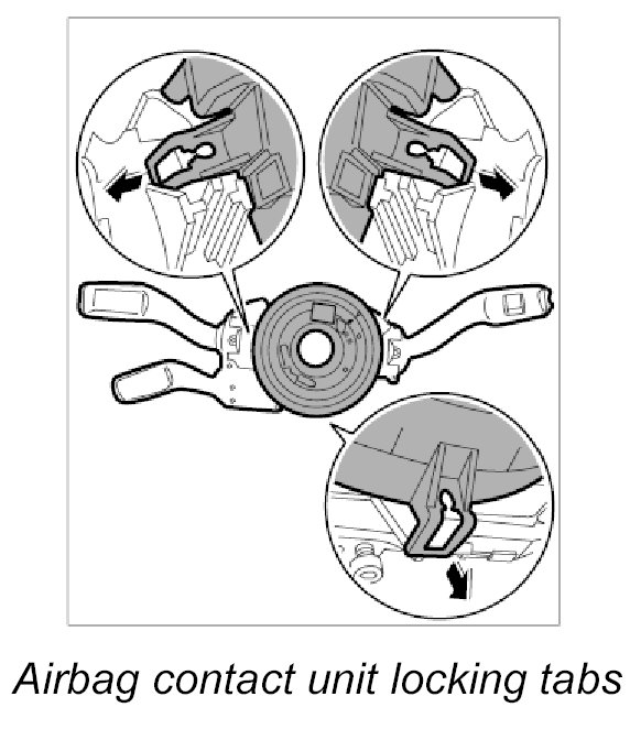 - To position the airbag contact unit in the central position, press the locking element and turn the rotor carefully to the left as far as it will go.
