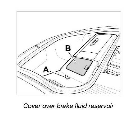 1. Disengage and remove cover over brake fluid reservoir -B-.