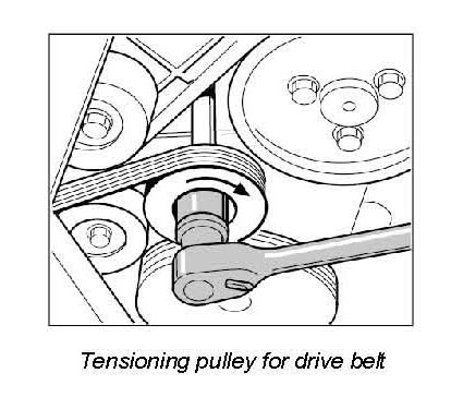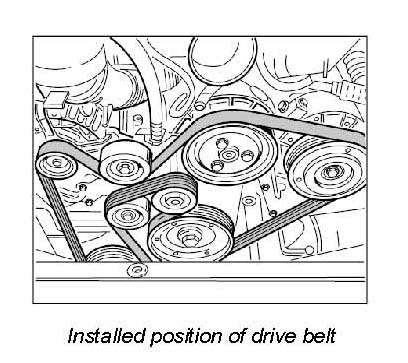 1. Install the drive belt as shown in the illustration. Position the drive belt by taking the tension off tensioning pulley in a clockwise direction then allow the pulley to slide back to its normal position.