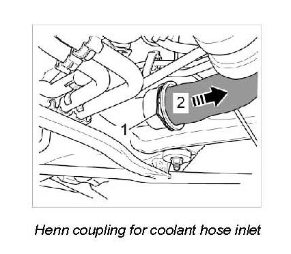 4. Open supply and return hoses at radiators. Do this by pulling off the spring clips for the two Henn couplings -1- and pulling the hoses away from the coolant pipes -2-. Collect coolant in a clean container. Insert the clips in the correct position in the connectors and connect the hoses. The connection should audibly snap into place. Check correct positioning once again by pulling on the hoses.