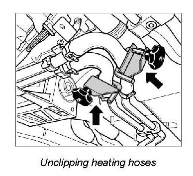 5. Remove heating hoses on underside of car. Secure the pipes with hose clips and then open the spring band clamps. Remove both hoses and slowly open hose clamps. Allow coolant to drain into a clean container. Clean hoses, stick them back and attach the clips. Check that the hoses are firmly in place.