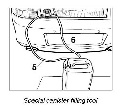 4. Place a canister with a sufficient amount of coolant and with an antifreeze content of -35°C behind the vehicle near to the expansion tank.