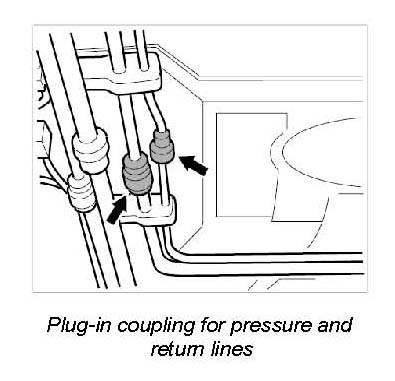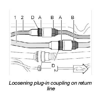 1. Loosen return line (thicker line) at the connection point (plug-in coupling) -arrow- in the rear sill area on the left.
