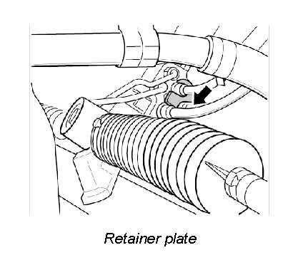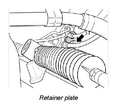 2. Loosen pressure and return lines at the steering gear. To do this, loosen the hexagon socket head bolt -arrow- and remove the retainer plate (with the front wheels turned in as required). Close off lines or use a collecting container.