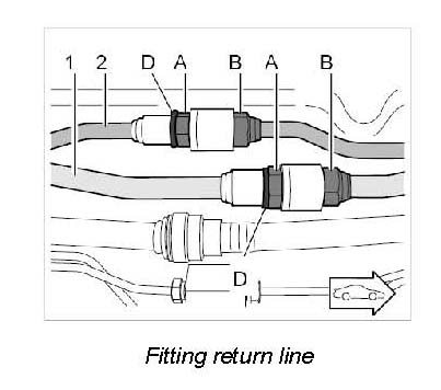 The steering return line -1- is fitted on the steering gear and also on the plug-in coupling (connection point) in the rear sill area.