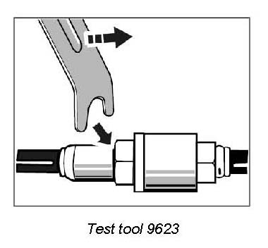 2.2. Check that the plug-in coupling is engaged correctly using special tool test tool 9623. Insert special tool into the groove and check that the connector is seated correctly in the plug-in coupling by applying slight pressure. The connector must not slide out. The plug-in coupling is designed so that there is axial play of approx. 1 mm in the plug-in coupling.