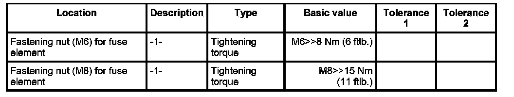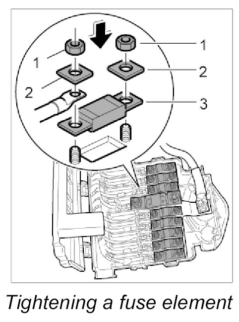 3. Place the fuse element -3- into position, fit the washer -2- and secure with the fastening nuts -1-. Tightening torque: M6>>8 Nm (6 ftlb.) Tightening torque: M8>>15 Nm (11 ftlb.)