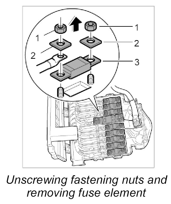 2. Unscrew the fastening nuts on the faulty fuse element -1-, remove the washer -2- and take out the fuse element -3-.