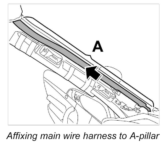 9. Remove protective film of adhesive strip on main wire harness -area A- and affix main wire harness to A-pillar.