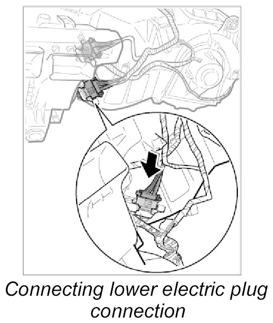 14.3. Push in lower electric plug connection at heater/air-conditioning unit until it is felt to engage.