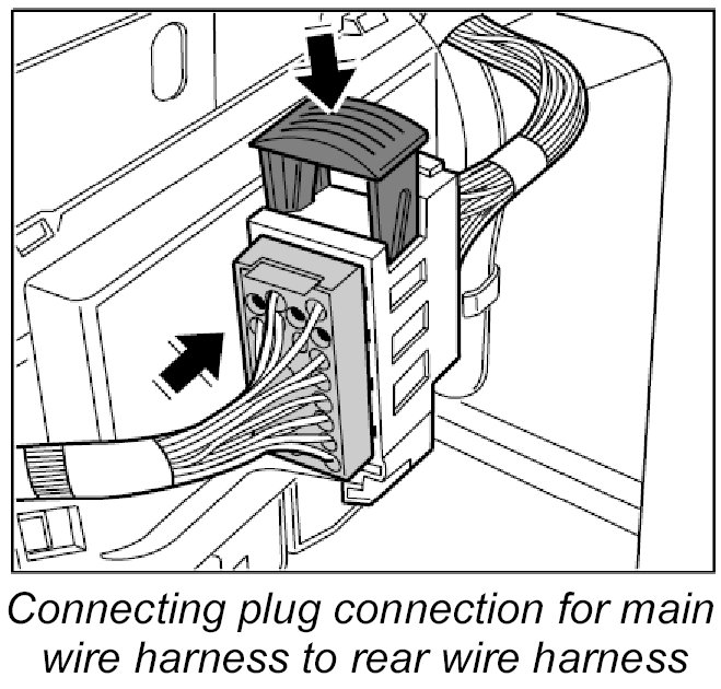 32. Connect plug connection between main wire harness and rear wire harness at the left and right -33 and 34- and lock it.