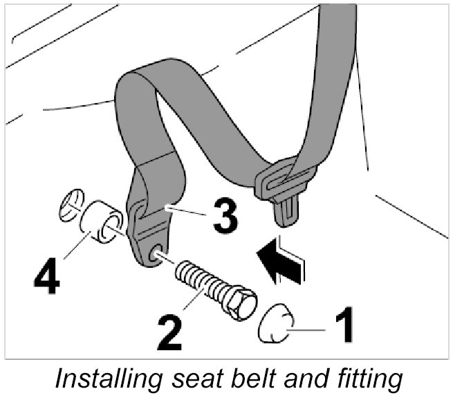 3.1. Tighten fastening screw -2-, seat belt with fitting -3- and spacer sleeve -4- on inner lower side member. Tightening torque: 50 Nm (37 ftlb.)