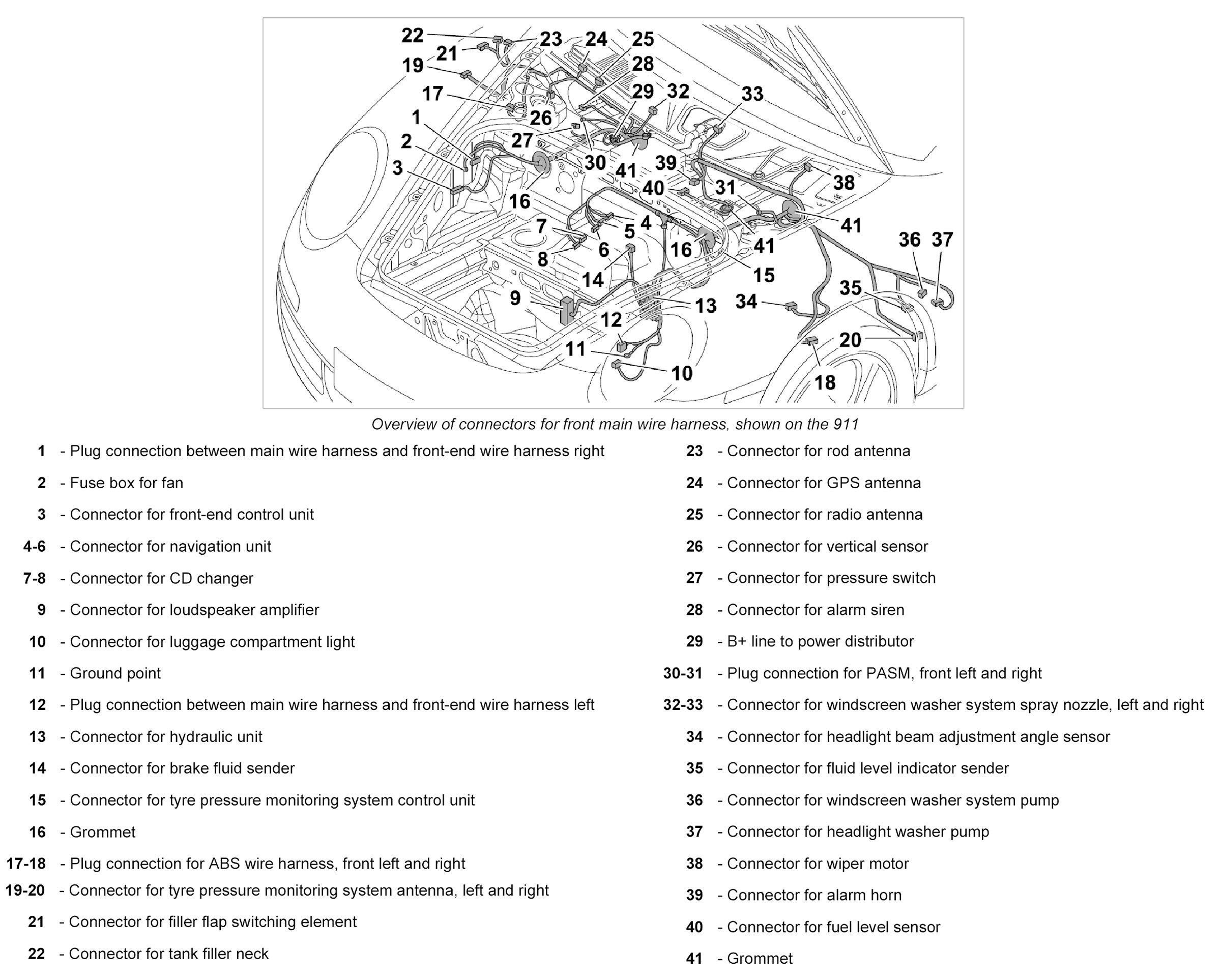 21. Push on connectors of front antenna for tyre pressure monitoring system -19 and 20- at left and right until they are felt to engage.