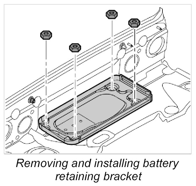 5. Position battery retaining bracket and secure with the four fastening nuts. Tightening torque: 10 Nm (7.5 ftlb.)