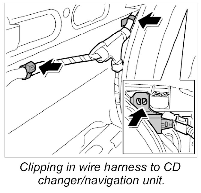 25. Clip in wire harness to CD changer/navigation unit -arrows-.
