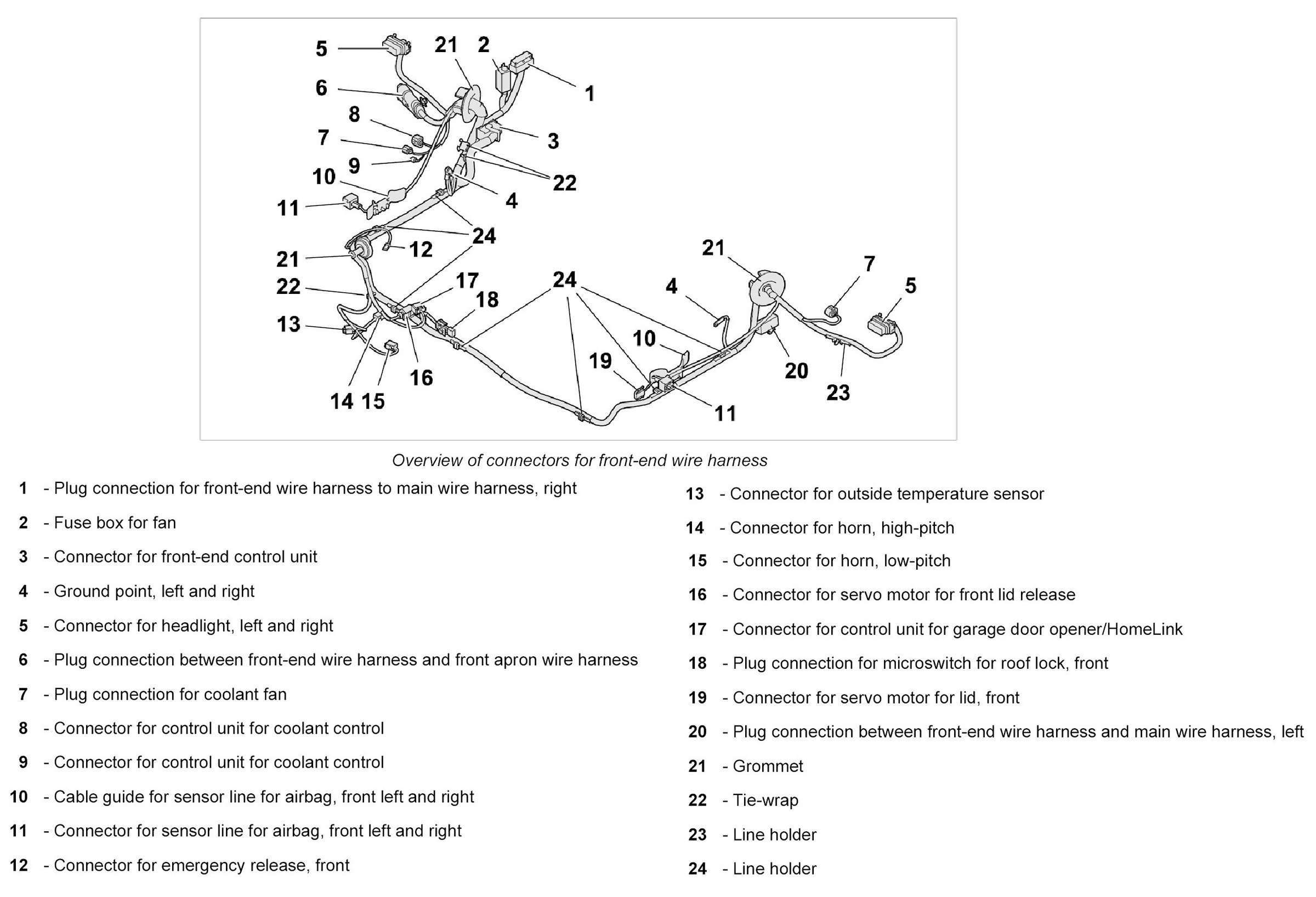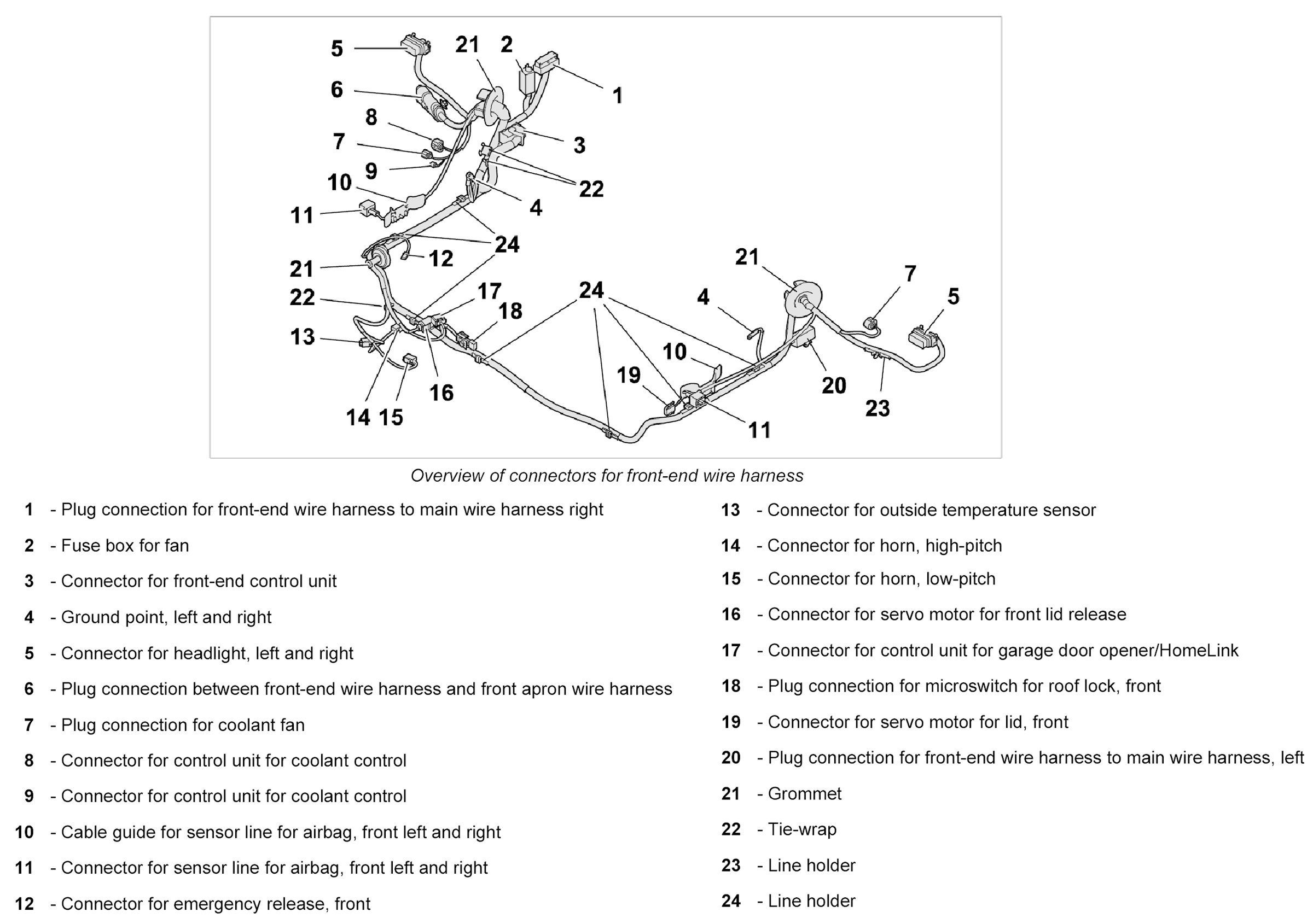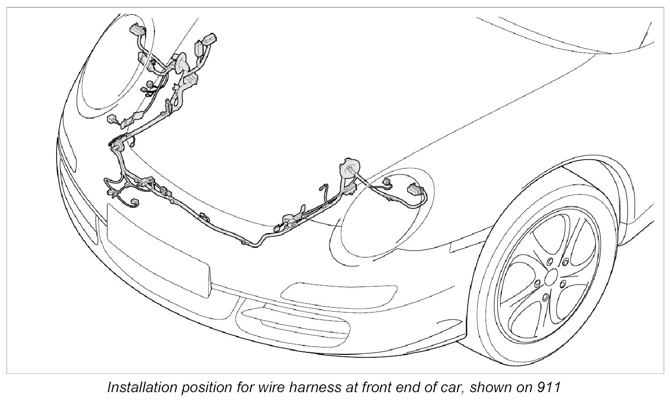 - The wire harness for front end spare parts scope means the scope for fully-equipped vehicles. Depending on the vehicle equipment, connectors not required are tied to the wire harness for front end using tie-wraps.