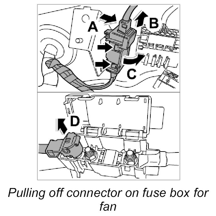 2.3. Pull off connector on fuse box for fan -arrow D-.