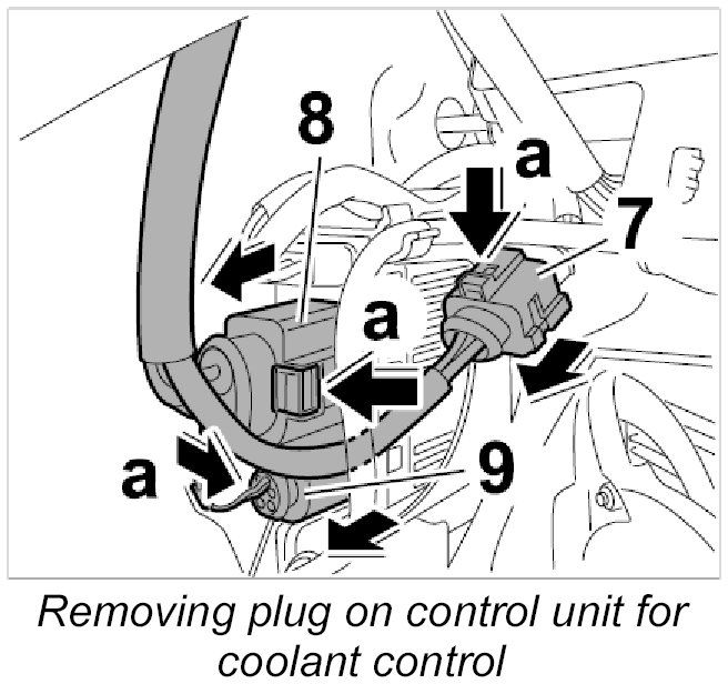 5. Pull off connector and plug connection on control unit for coolant control -7 to 9-.