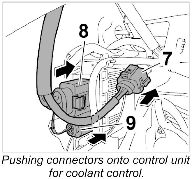 17.1. Push the two connectors onto the control unit for coolant control -8 and 9- until they engage securely.
