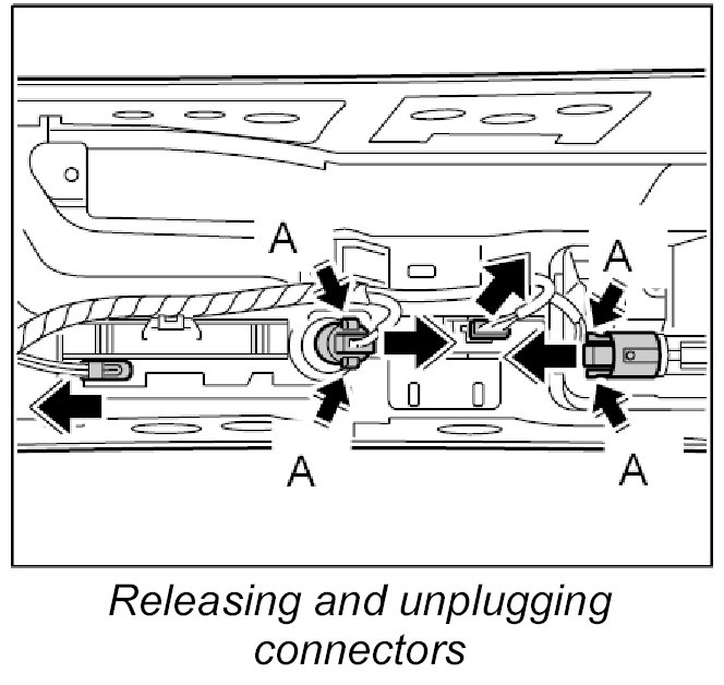 1. Release electric connectors for the equipment versions (e.g. cigarette lighter, interior sensor etc. -A- and unplug.