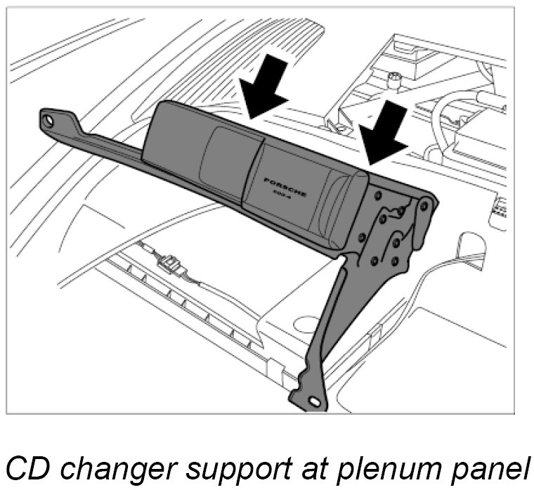 4. Lift up support together with CD changer and disengage retaining clips at the plenum panel -Arrows-.
