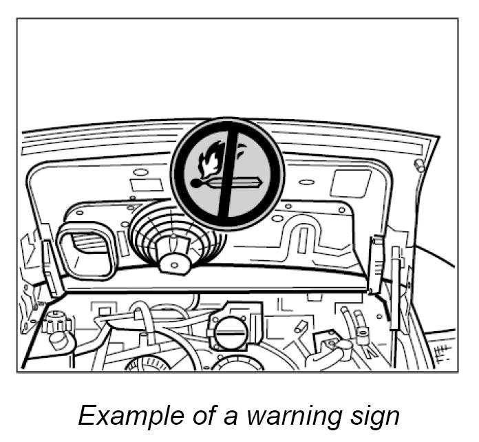 1. Place a warning sign in a clearly visible position in the work area or on the vehicle.