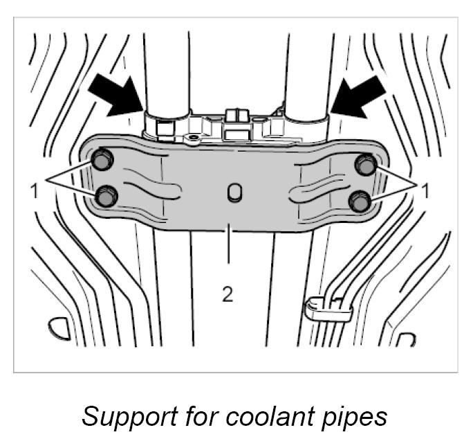 5. Fit coolant pipes in centre tunnel. Secure sheetmetal holder. - Tightening torque: 65 Nm (48 ftlb.)