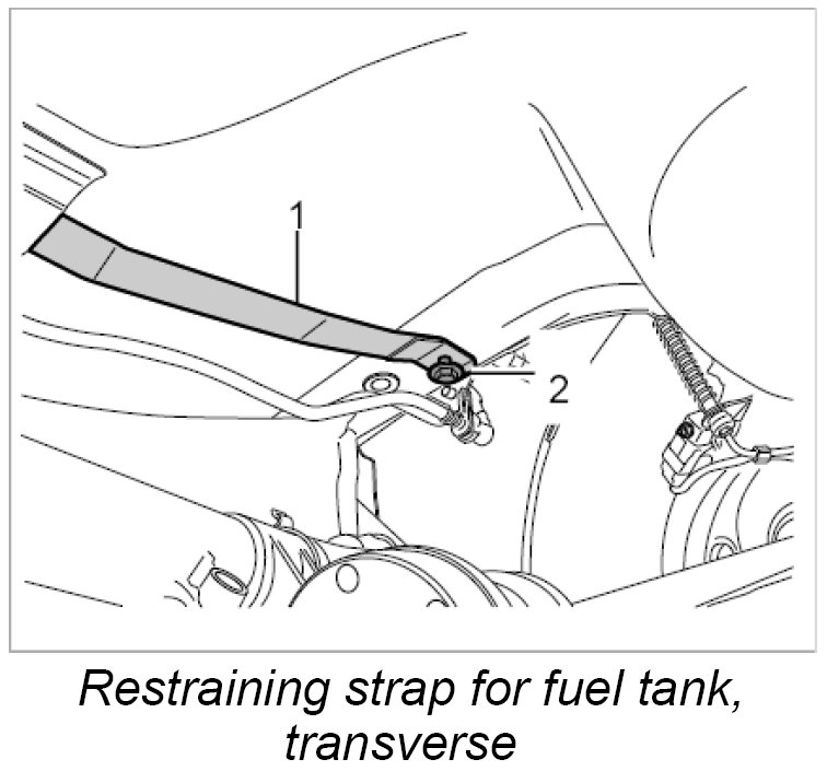 2. Place transverse restraining strap at the correct position on the tank and secure with two M8 screws. - Tightening torque: 23 Nm (17 ftlb.)