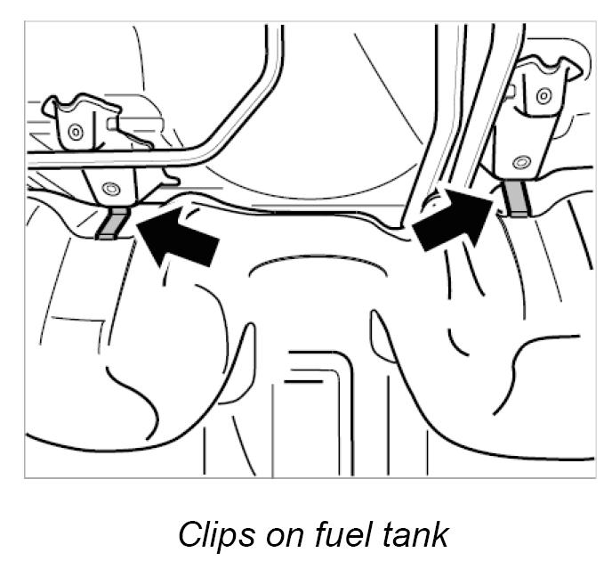 3. Unclip both clips on the body and get another person to help you lift the fuel tank out of the vehicle. To do this, first tilt the tank towards the right. Pay attention to the tank flange.