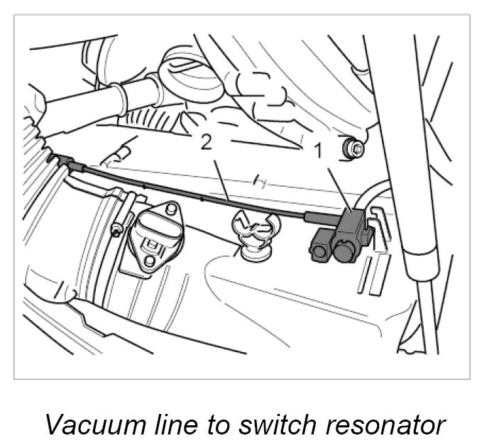 4. Unclip the switch-over valve for the switch resonator from the housing bracket -1- detach the vacuum line from the housing -2- and disconnect from the resonator.