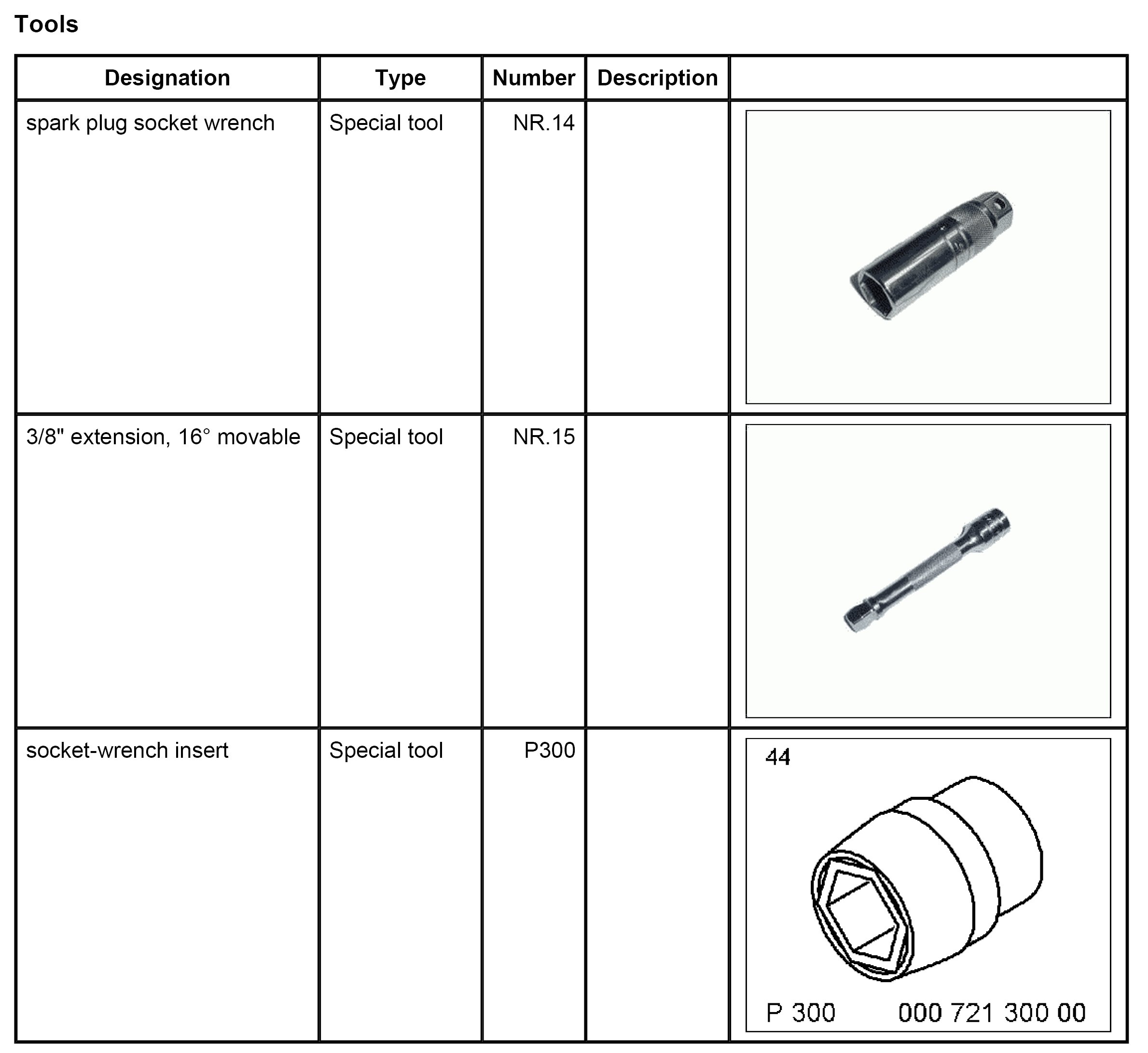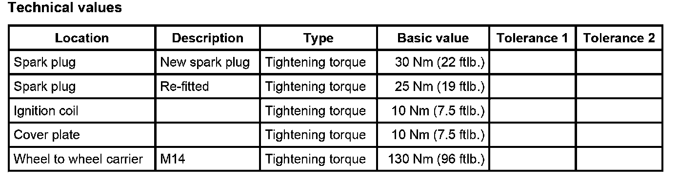 1. Fit spark plugs using spark plug socket wrench NR.14 and 3/8 inches extension, 16 degrees movable NR.15. - Tightening torque: 30 Nm (22 ftlb.) The tightening torque is reduced if the spark plugs are removed and installed again for another activity. - Tightening torque: 25 Nm (19 ftlb.)