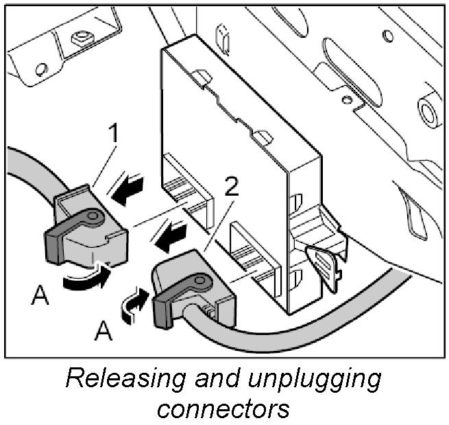 4. Release both electrical connectors -1, 2- -A- and unplug them from the control unit.