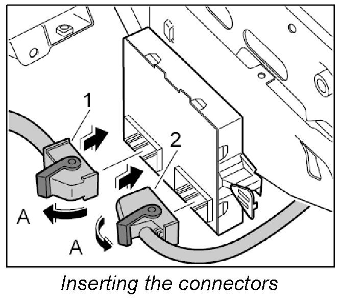 1. Press both electrical connectors -1, 2- into control unit and lock them until they are felt to engage.