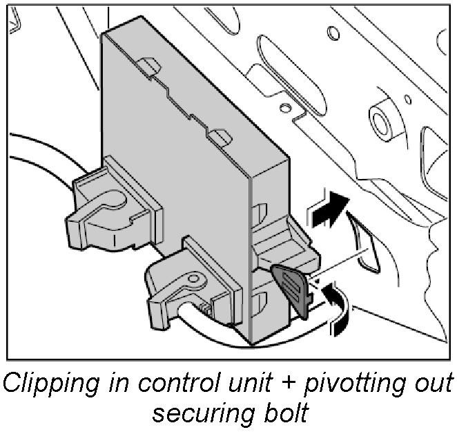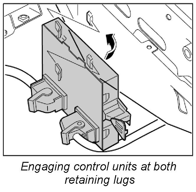2. Engage control unit in support for wiring harness with both retaining lugs.
