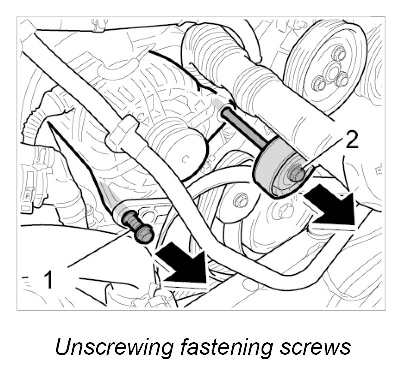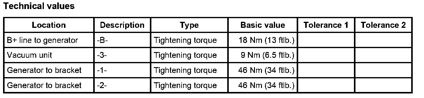 5. Secure the generator with the two fastening screws -1, 2-. - Tightening torque: 46 Nm (34 ftlb.). - Tightening torque: 46 Nm (34 ftlb.)