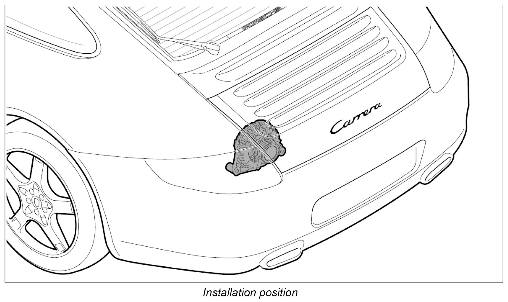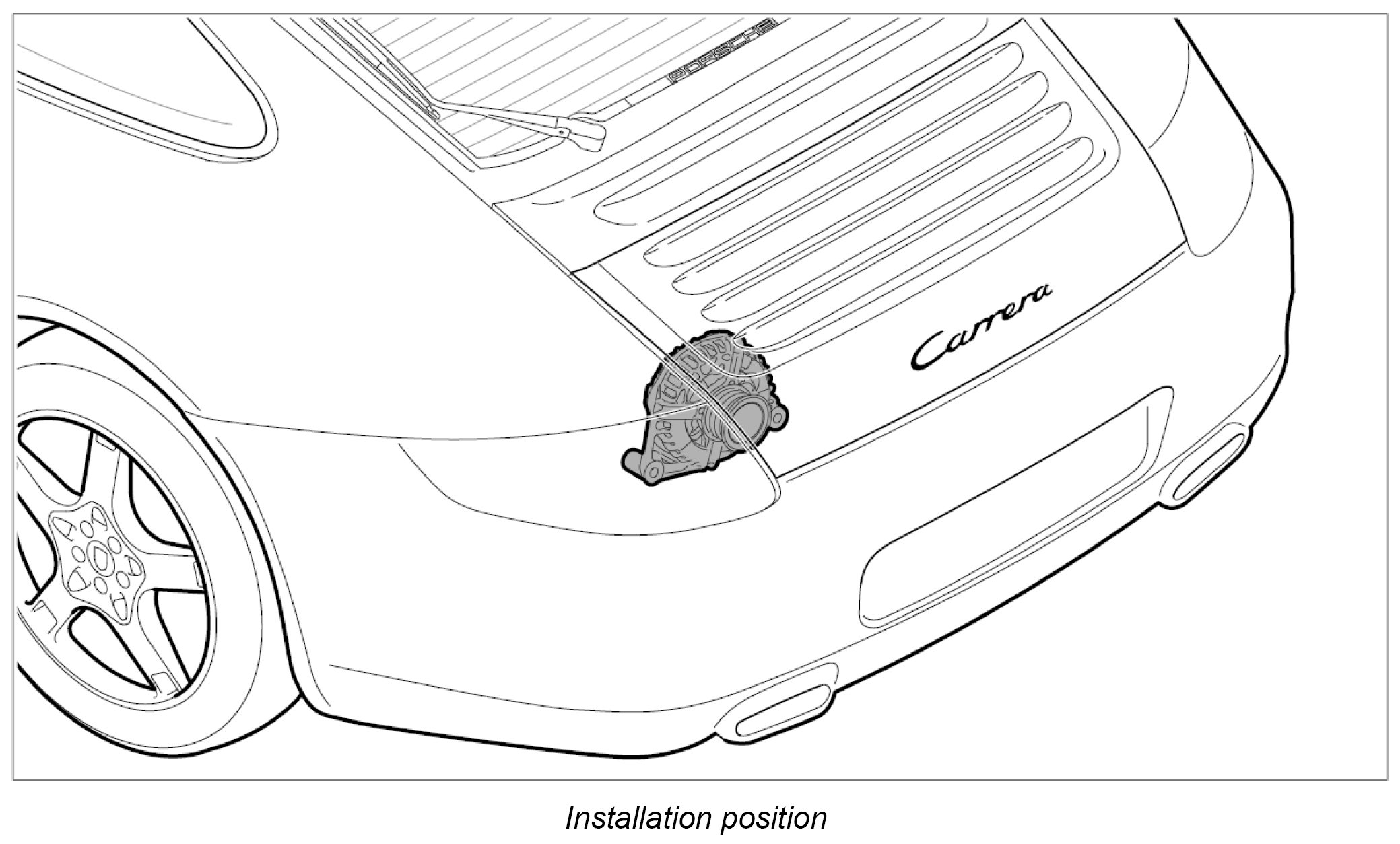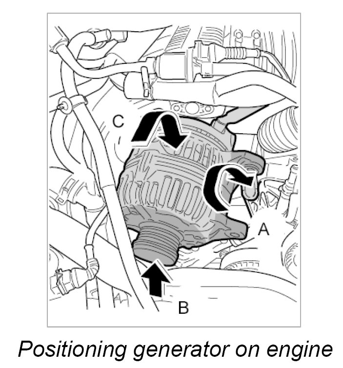 3. Insert the generator into the engine area -C-, then push upwards -B- and lift over the bracket -A-.