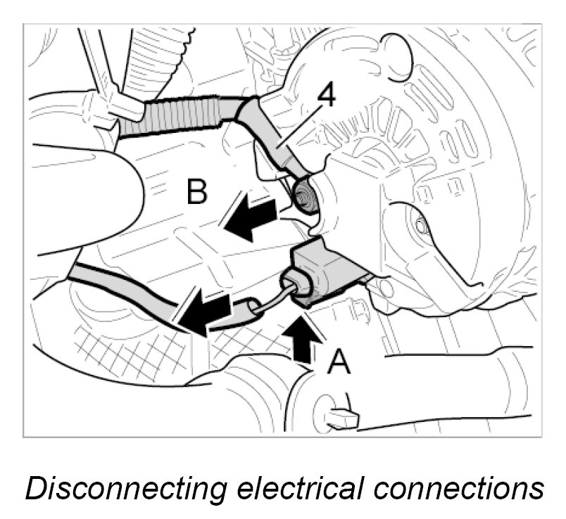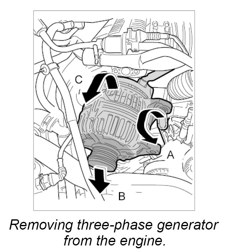 3. Lift the right generator over the bracket on the engine -A-, then pull forwards and down -B- and raise clear of the engine from the rear -C-.