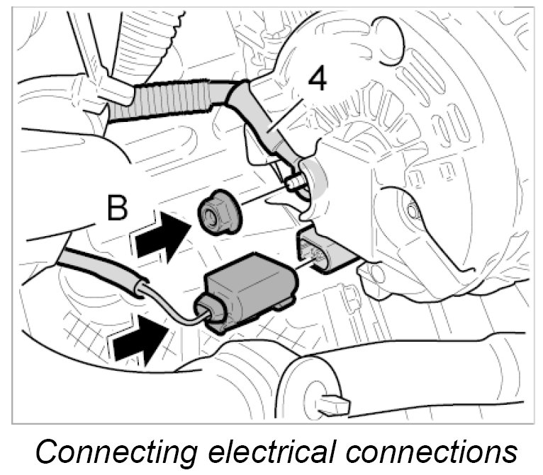 1. Position the generator on the engine, fit the B+ line -4- and secure with the fastening nut -B-. - Tightening torque: 18 Nm (13 ftlb.)