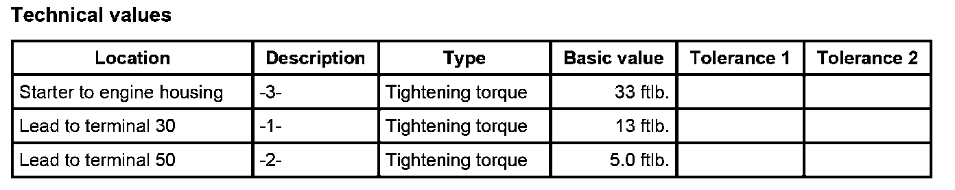 3. Position electrical leads on the starter and tighten with fastening nuts -1, 2-. - Tightening torque: 13 ftlb. - Tightening torque: 5.0 ftlb.
